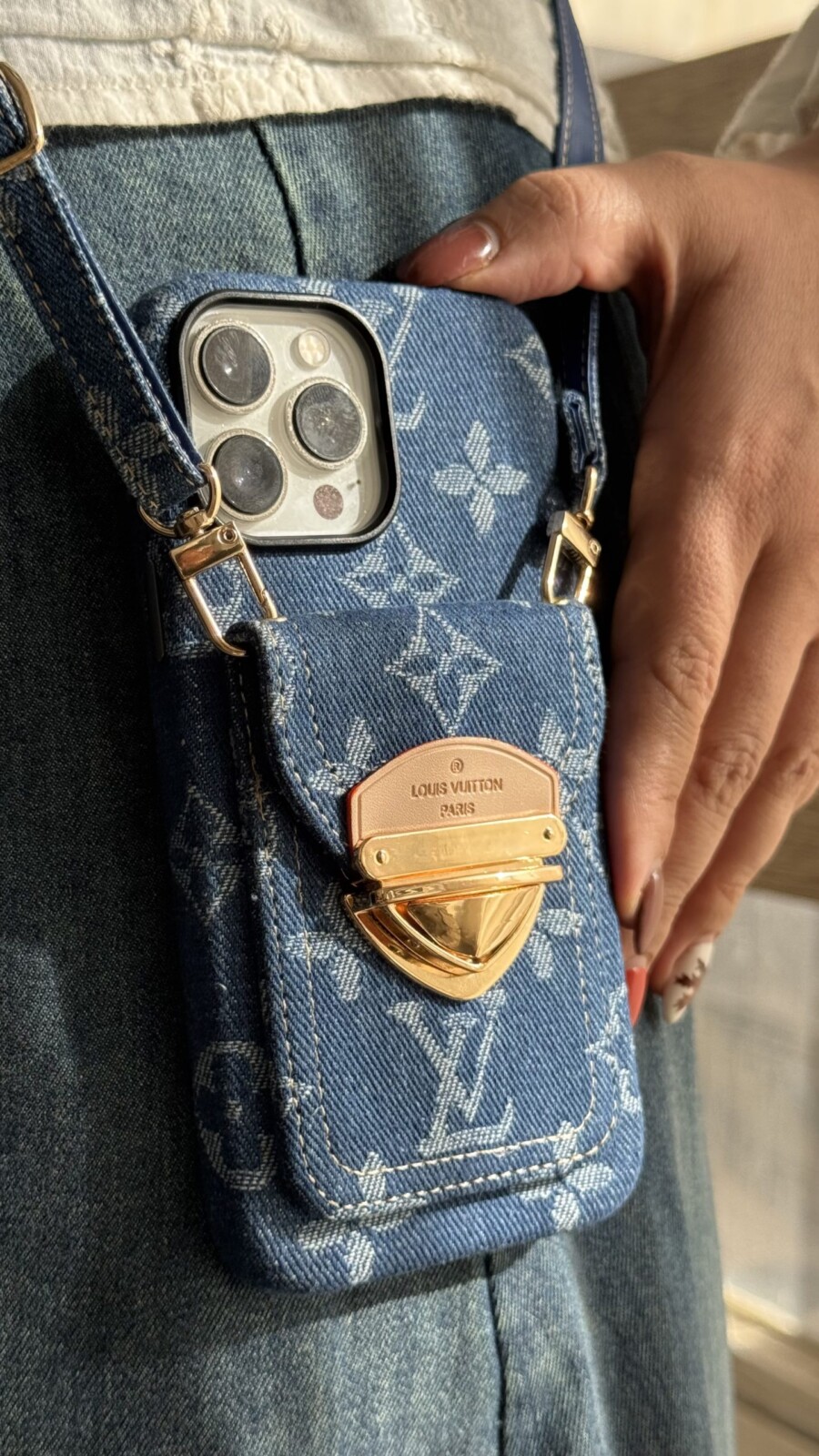 قاب موبایل آیفون لویی ویتون جین استایل جاکارتی دار + بندست