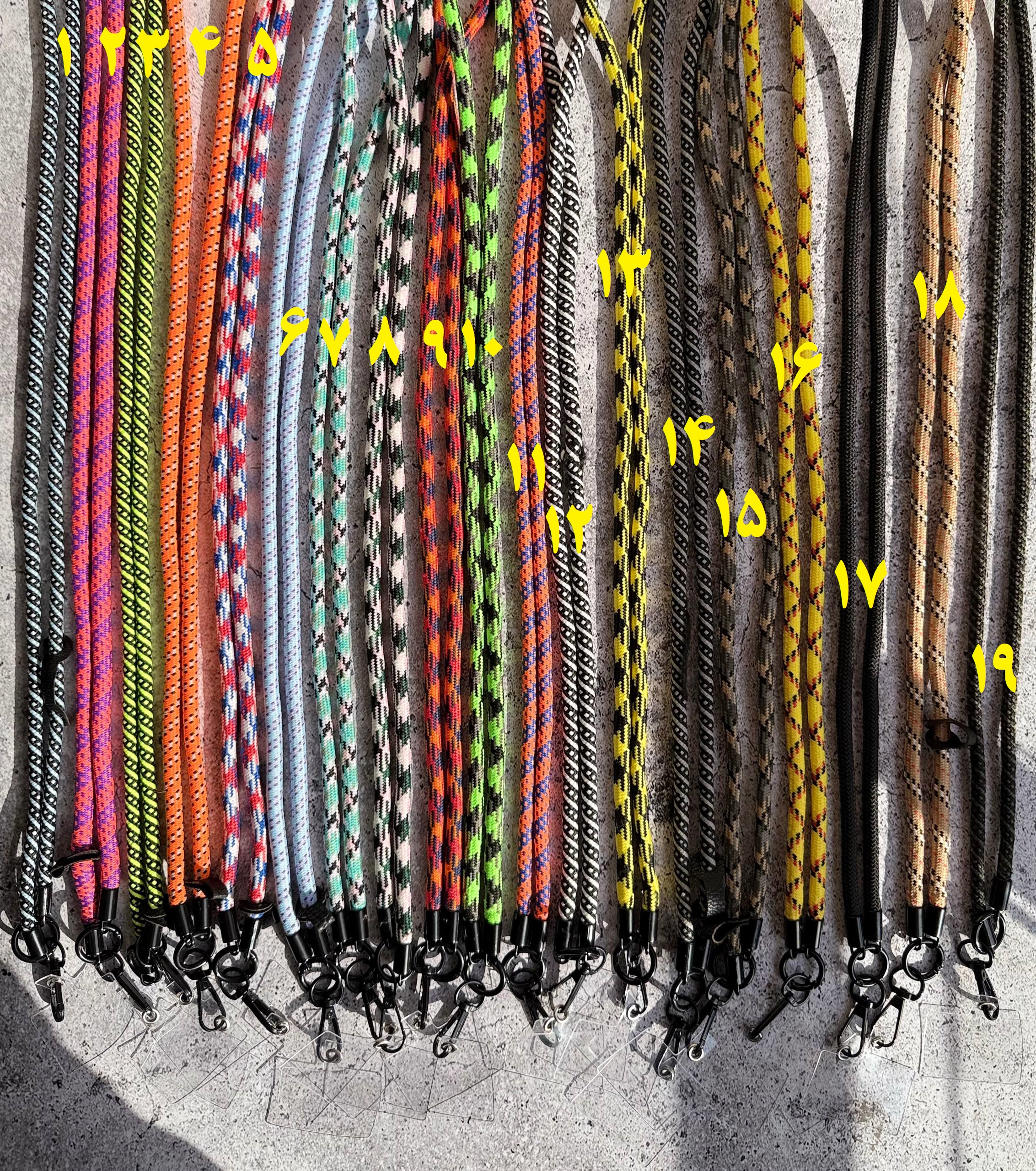 1-آبی مشکی ,10-لاین سبز مشکی طوسی ,11-نارنجی آبی نقطه دار ,12-مشکی سفید ,13- زرد مشکی ,14- مشکی طوسی ,15-کرم طوسی مشکی ,16-زرد قرمز مشکی ,17مشکی ساده ,18-کرم مشکی سفید ,19مشکی شطرنجی ,2- صورتی بنفش ,3-سبزمشکی ,4-نارنجی نقطه دار ,5-لاین آبی سفید قرمز ,6-آبی نقطه دار ,7-لاین آبی مشکی سفید ,8-لاین سبز سفید مشکی ,9-لاین نارجی قرمز آبی |